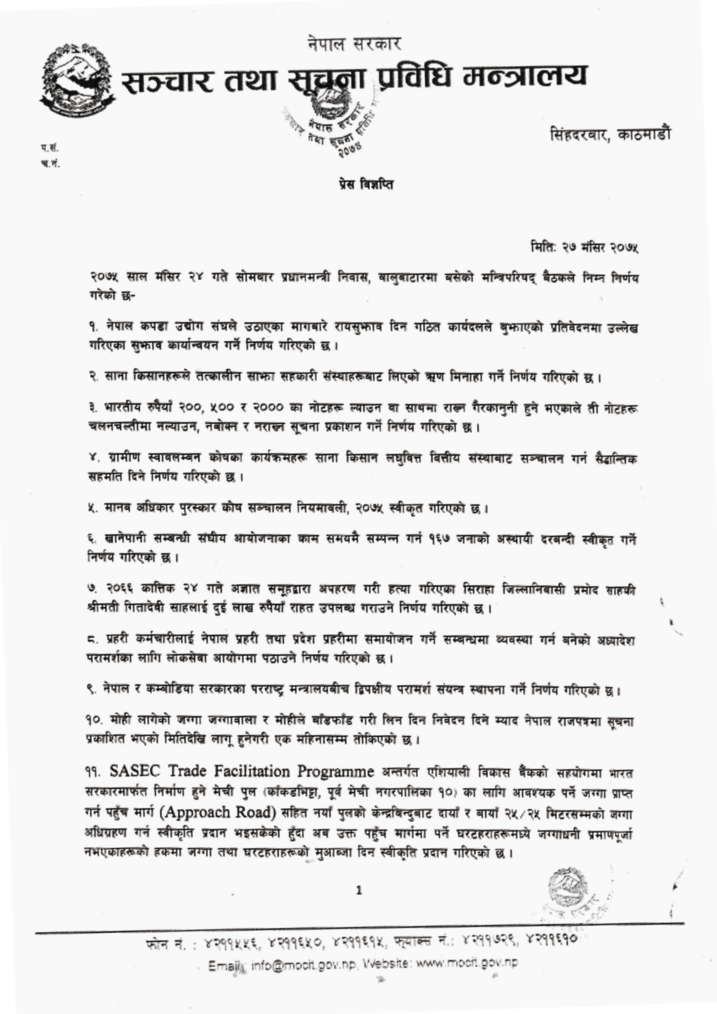 मन्त्रीपरिसदको गत मंसिर २४ गते सोमबार बसेको बैठकले तिन नोटहरु ल्याउन, बोक्न वा राख्न गैरकानुनी हुने सुचना प्रकाशन गर्ने निर्णय गरेको छ । छिमेकी देश भारतमा अधिकांस नेपालीहरु रोजगार तथा अन्य शिलशिलामा जाने गर्छन् । खल्ला सिमाना भएका कारण फर्कदा आफु संगै बोकेर भारतीय रुपैयाँ नेपाल ल्याउने र चलनचल्तीमा ल्याउने प्रचलन रहेको भए पनि अबका दिनमा ति नोटहरु ल्याउन र साथमा राख्न नपाइने भएको हो ।