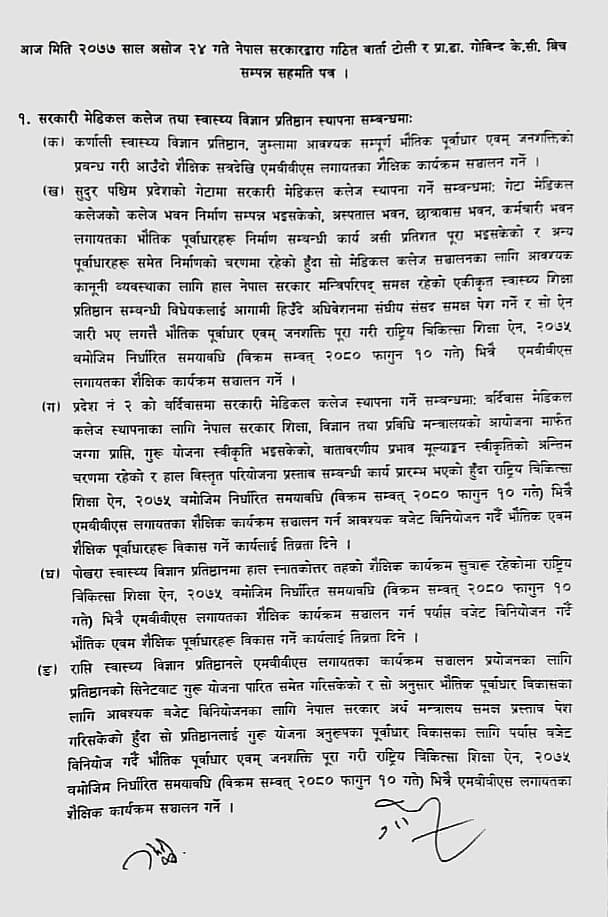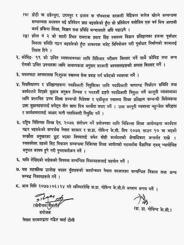 सहमतिपत्रमा सरकारी वार्ता टोलीका संयोजक गोपीनाथ मैनाली र डा.केसीले हस्ताक्षर गर्नुभएकाे छ ।