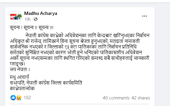 आचार्यले सामाजिक स‌जालमा लेख्नुभएको छ, ‘मतदाता नामावली सार्वजनिक नभएको र जिल्लाको १३ वटा पालिकाका लागि निर्वाचन प्रतिनिधिसमेतको सुनिश्चित नभएको कारण भोलि हुने भनिएको पालिकास्तरीय अधिवेशन अर्को सूचना नभएसम्मका लागि स्थगित गरिएको सम्बद्ध सबै साथीहरूलाई जानकारी गराइन्छ ।’